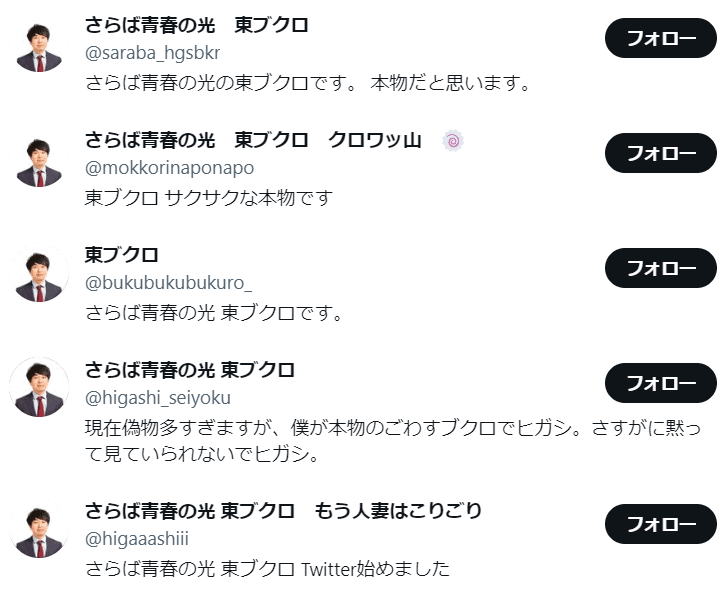 Twitter、Instagram、TikTok、note、facebook等・・全てのSNSで東ブクロ本人のアカウントは確認出来ませんでした。特にTwitterでは、「さらば青春の光 公式Youtubeチャンネル」でもよくネタの1つにされていることから、偽物のアカウントが大量発生していました。